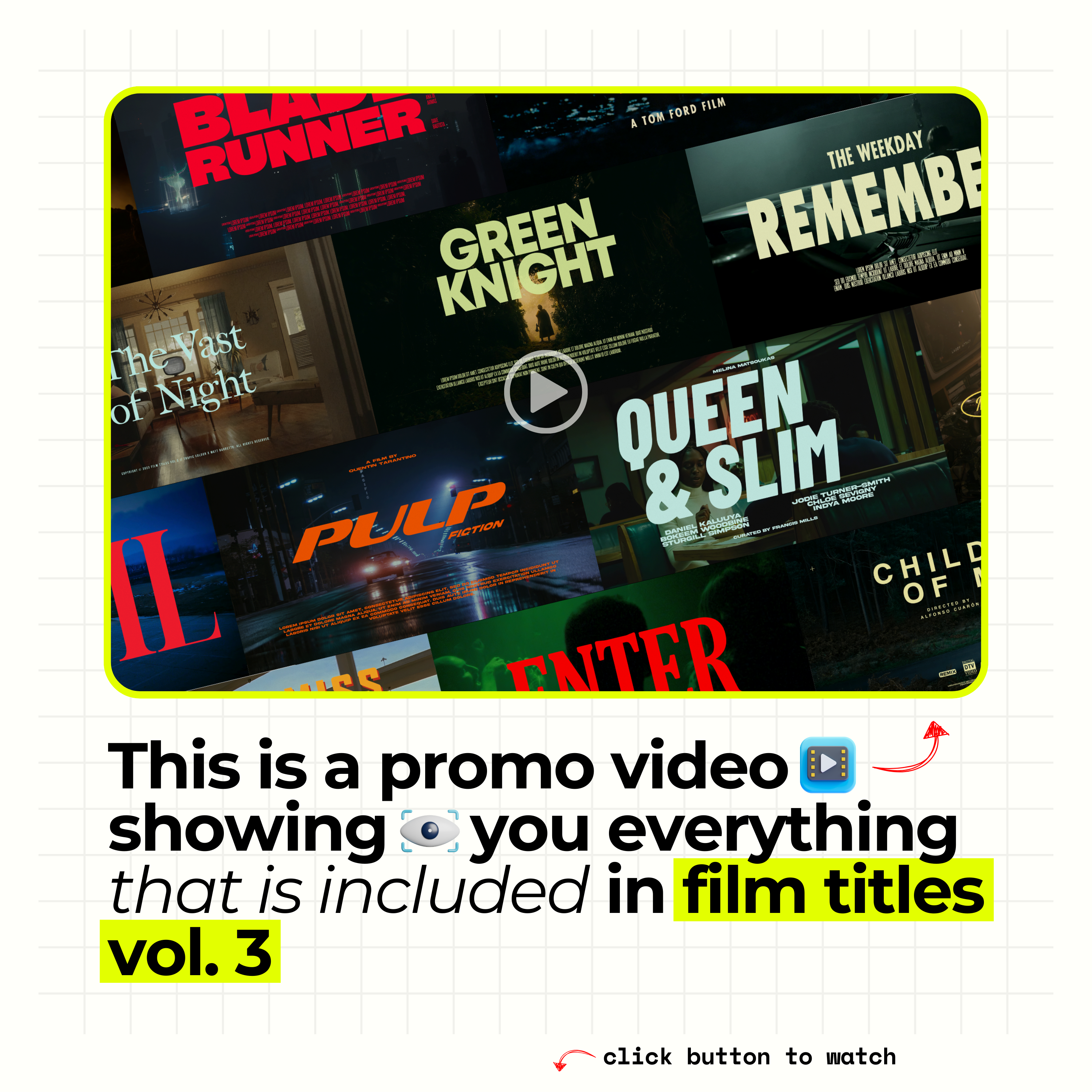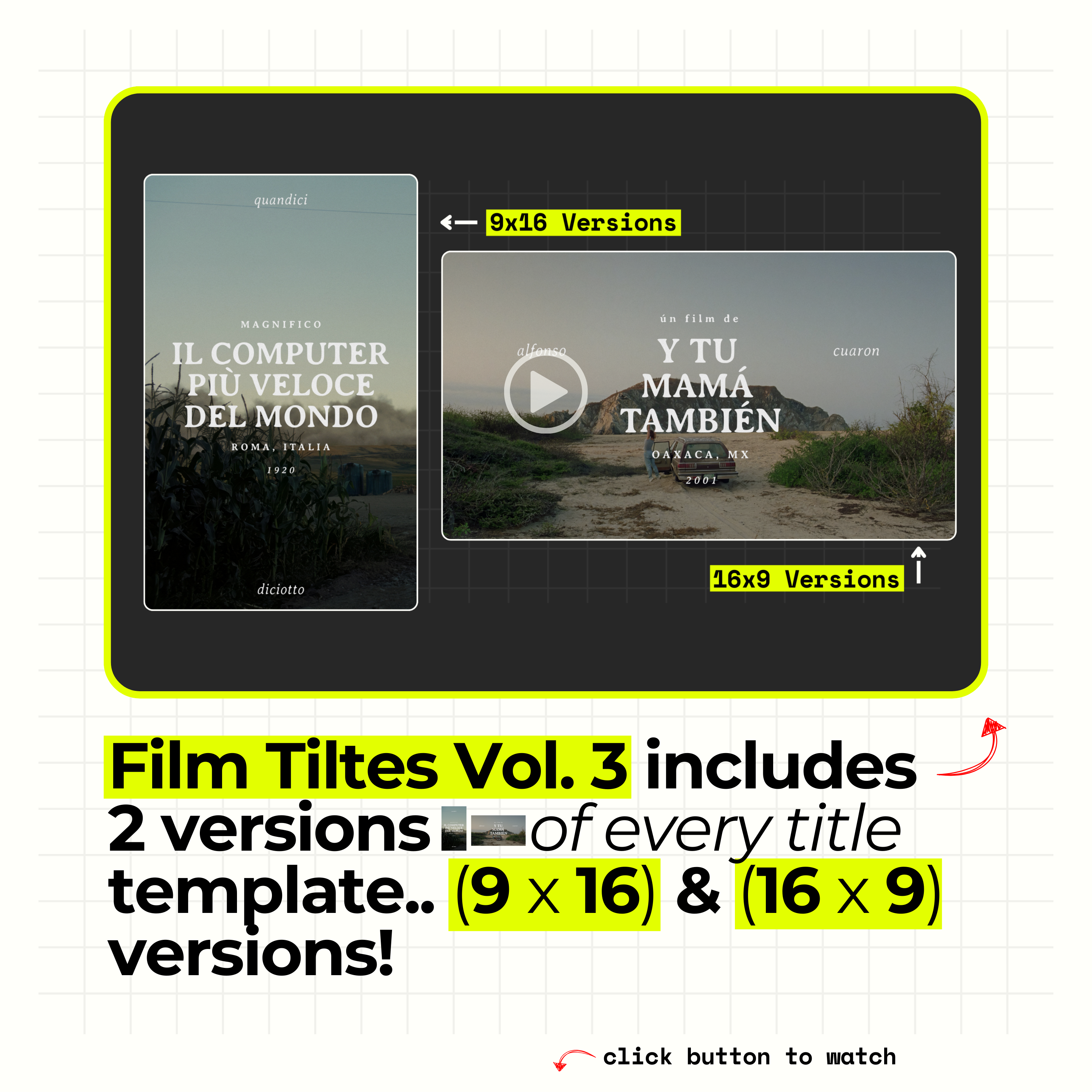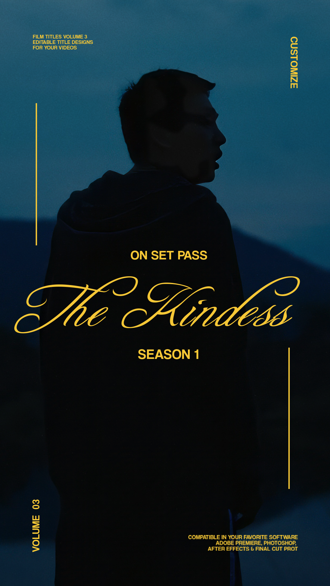 Everyone struggles with title design... so that's why we partnered with some of the industry's best graphic designers to bring you FILM TITLES VOL. 3! This pack contains 20 robustly built titles with 2 versions of each titles [16x9 & 9x16] that work seamlessly within the editing software of your choice! (Premiere / Final Cut / Photoshop)