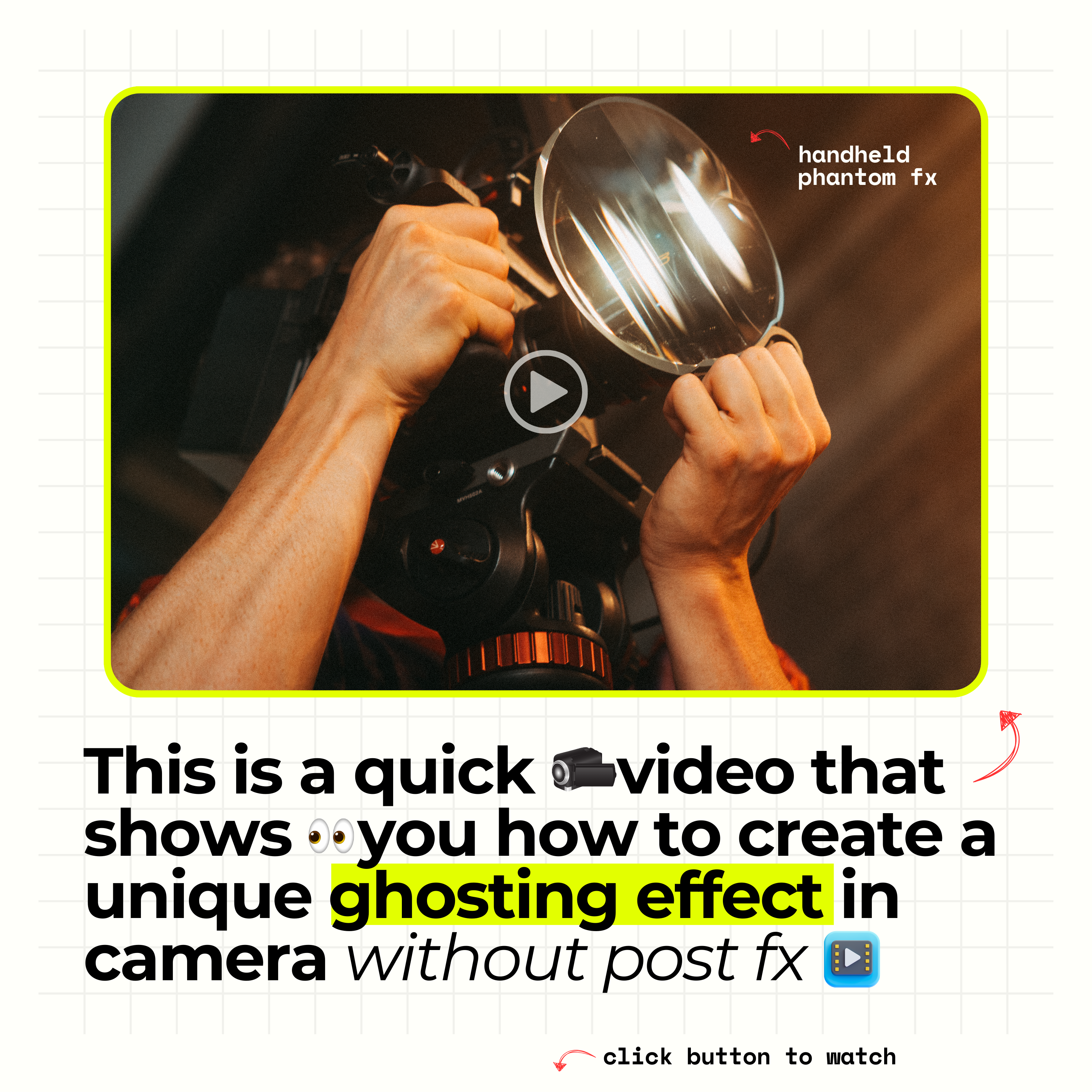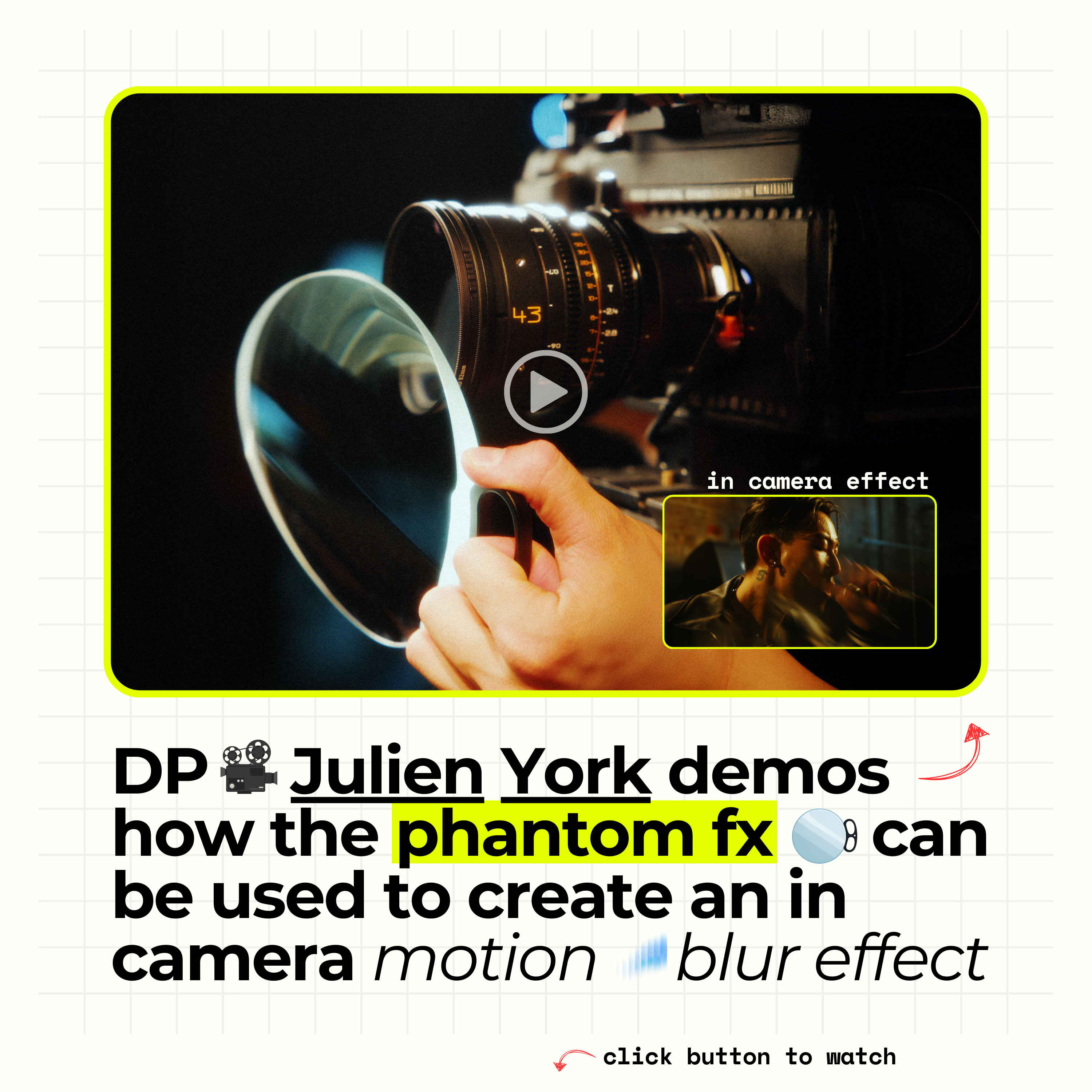 The Phantom FX filter creates a ghosting motion blur / "slow shutter" effect right in camera when held directly in front of your lens. The handheld design allows you to dodge it in front of your lens, enabling you to get the exact look you are going for!